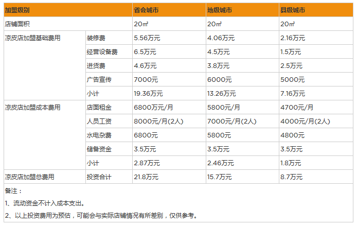 我們以一家面積20㎡的店鋪做參考,因地理位置不同,房租費用也有高低,我們以二線城市的店租約估計2000左右;簡單的裝修費用約估計2萬左右;普通的設備費用2萬元左右;前期原材料3000元左右,水電雜費1200元左右。因此我們可以大概的算出加盟開一家涼皮店要多少資金?開一家涼皮店,總投資費用大概要4-10萬元。
