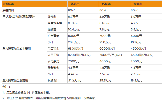 魚火鍋店的回本期一般在半年以內(nèi),前期投入加盟費(fèi)、裝修費(fèi)一般為2-5萬(wàn)元左右,我們計(jì)算的是在魚火鍋店回本后,正常經(jīng)營(yíng)階段的利潤(rùn)情況。