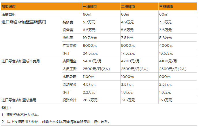 開家進口食品加盟店投資一般需要多少錢?60㎡總投資15萬元