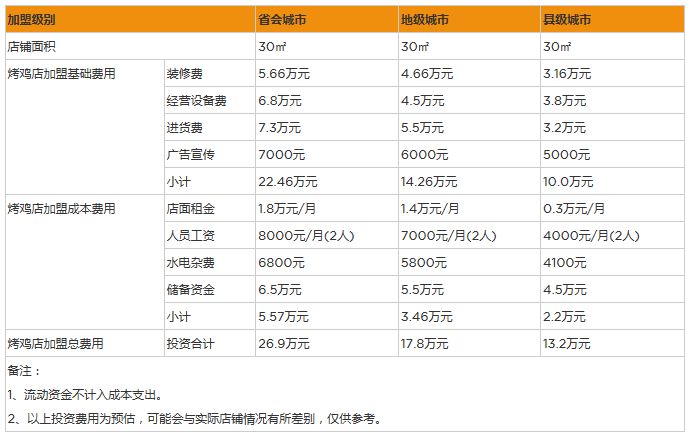 除了以上這些開銷,開烤雞店還需要預(yù)備一部分流動資金,這部分資金主要用于購買食材和發(fā)放工資。購買食材的費用視店面的經(jīng)營情況而定,每月幾萬元比較適中。工資方面,由于店面比較小,員工兩三個就足夠,耗費的資金不多。(以上數(shù)據(jù)僅供參考,不作為任何投資承諾與保證)。