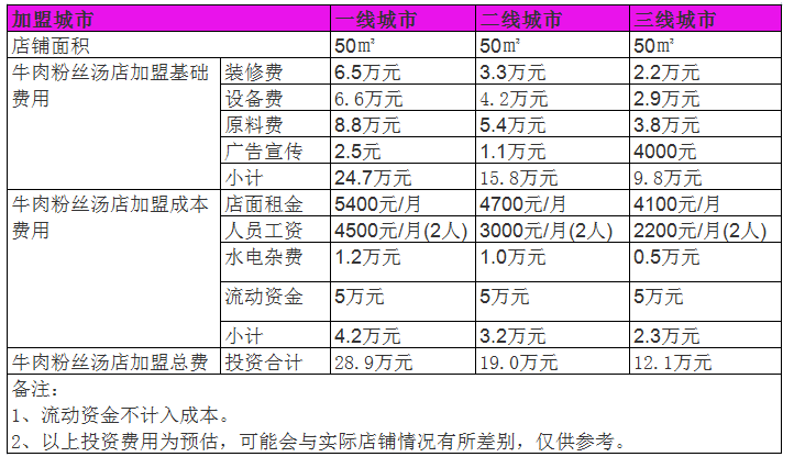 我們可以看到淮南牛肉湯加入總費用在12萬元左右,當然,具體的投資成本要以實際為準。