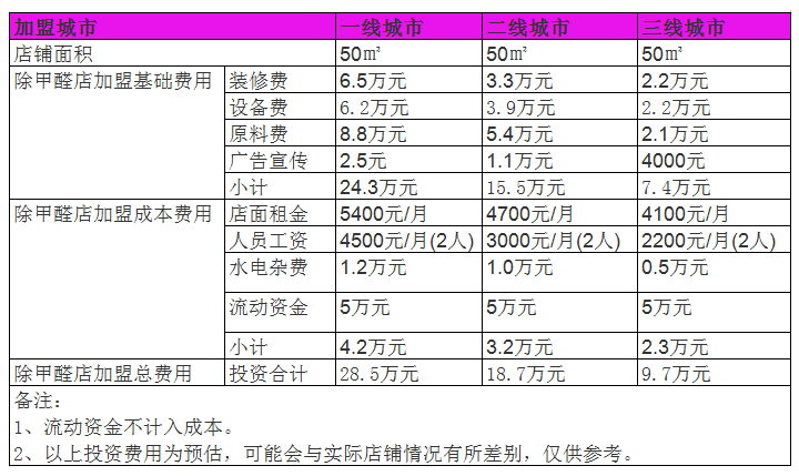 您需要考慮施工的資質要求暨除甲醛公司總部的實力如何,另外您需要了解周邊人均消費水平如何、相對應的店面、租金、原材料、設備等都需要考慮到。
