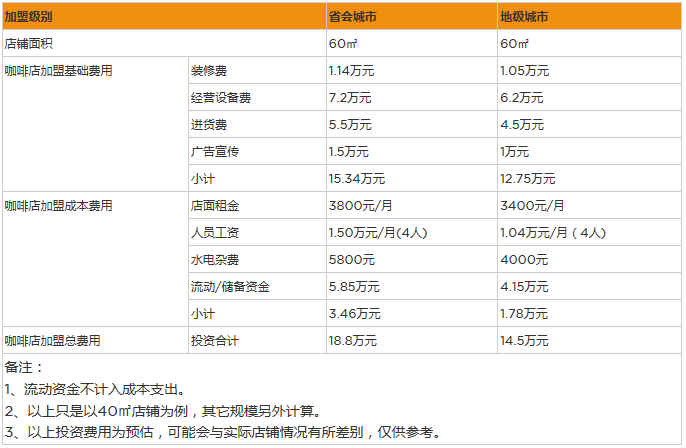 開家咖啡店投資大概多少錢?八項(xiàng)成本投資18.8萬(wàn)元