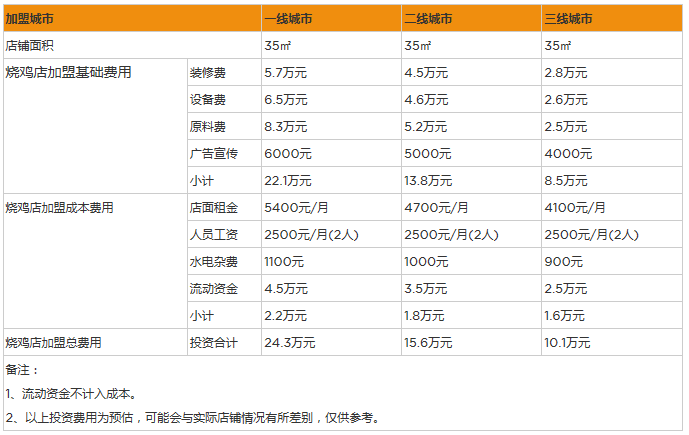 小編這里就以一家面積規模為40平方米的燒雞店為例,和大家介紹一下大概的投資成本費用。這里的門店規模,在一般的地級城市租金大概在5000元左右,裝修費用需要大概2-3萬元,用于做燒雞必要的設備費用大概也在2-3萬元之間,加上一些原材料的費用,在1-2萬元左右,加上水電和人工、流動儲備金等一些必要的投資成本,投資費用預計需要10-12萬元左右。