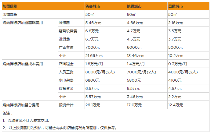 開一家烤肉拌飯首先得加盟一個好的品牌,而加盟品牌總是需要繳納一定加盟費的,在這方面的成本花費大約在1-5萬元。