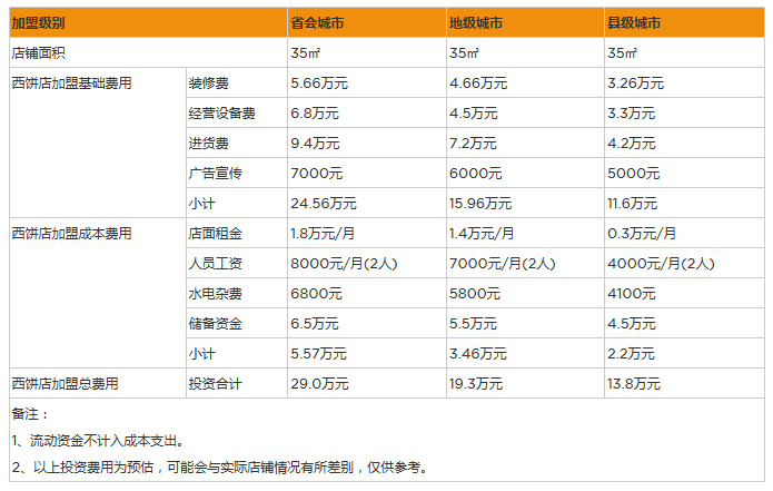 準備開一家西餅店還需要一些前期的準備費用,比如人員培訓、經營手續辦理、水電費、宣傳營銷等,這些費用一般有2-3萬即可。