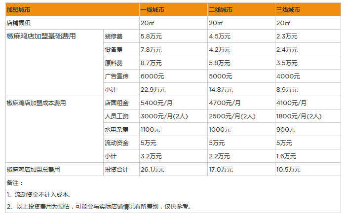 下面再讓我們相識一下投資椒麻雞需要幾多錢?開一家椒麻雞,除了2萬元-5萬元的加盟費之外,本錢費也是不行少的,椒麻雞自己就屬于本錢低的項目,物料費的話約莫在1萬元閣下,設備費也在5000元之間,開銷較大的就是房租用度了,房租費的話,放眼當下的市場,一家20平米的椒麻雞店肆,房租一般在3000元/月閣下,水電費一個月100,活動資金籌備一萬,剩下的人工費可以免去,為什么呢?因為椒麻雞店肆易上手,就可以或許輕松開店,整體算下來,十萬元就可以開店!