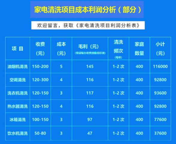 如果再增加其他家電清洗項目,例如:油煙機清洗、空調(diào)清洗、洗衣機槽清洗、飲水機清洗、太陽能清洗、鍋爐除垢保潔、冰箱消毒、家電清洗加香,除了家電清洗,管道水管清洗還有家政保潔,室內(nèi)除甲醛,殺菌消毒除螨,沙發(fā)窗簾免拆洗等項目收益就更高。